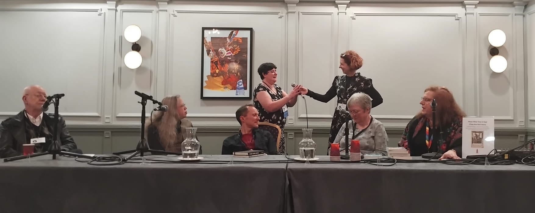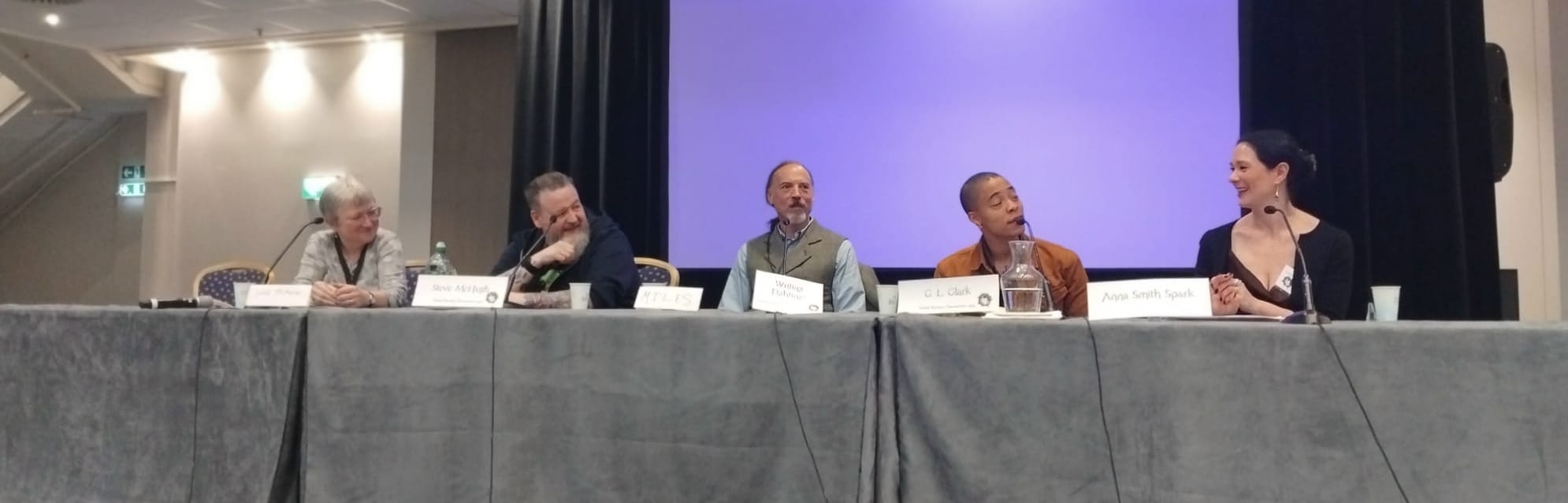 Since Covid, my Con-going has been pretty sparse, partly because of the change in job (don’t go to trade any more and work a lot of weekends) and partly just due to the shifting of the Con landscape. I did see a great many wonderful people, though, in the Dealers’ Room (including my old trading neighbours, Genki Gear), in the bar, and across the hotel. Caught up with some excellent panels, firstly the Write for the Fight panel, featuring Juliet McKenna, Steve McHugh, Miles Cameron, C J Clark (have had the Ambessa book on face-out for the last couple of months, so it was great to put a face to the name), expertly modded by Anna Smith Spark (whose Judge Anderson novel is next on my TBR). It’s the one I’m usually on, hence always of high interest, and it provided some excellent insights. Definitely worth another newsletter, hopefully next week.