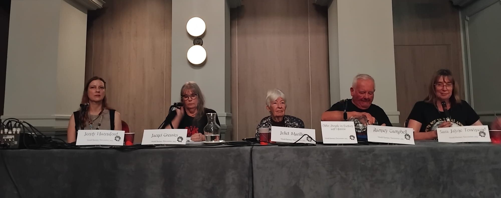 The Wizard’s Tower launch was excellent (was able to grab a copy of Ruthanna Emrys’/Andrew Knighton’s Wiz Duo novellas), as was the panel on older people in fiction, later in the day, featuring Jenny Hannaford, Jacqui Greaves, Juliet Mariller and Ramsey Campbell, equally expertly modded by Sara Townsend (who shares the D&D game). The age thing is another subject very dear to my heart (Augusta being in her forties, Lugan in his fifties, etc), and the whole Con brought me round to a bit of a realisation: